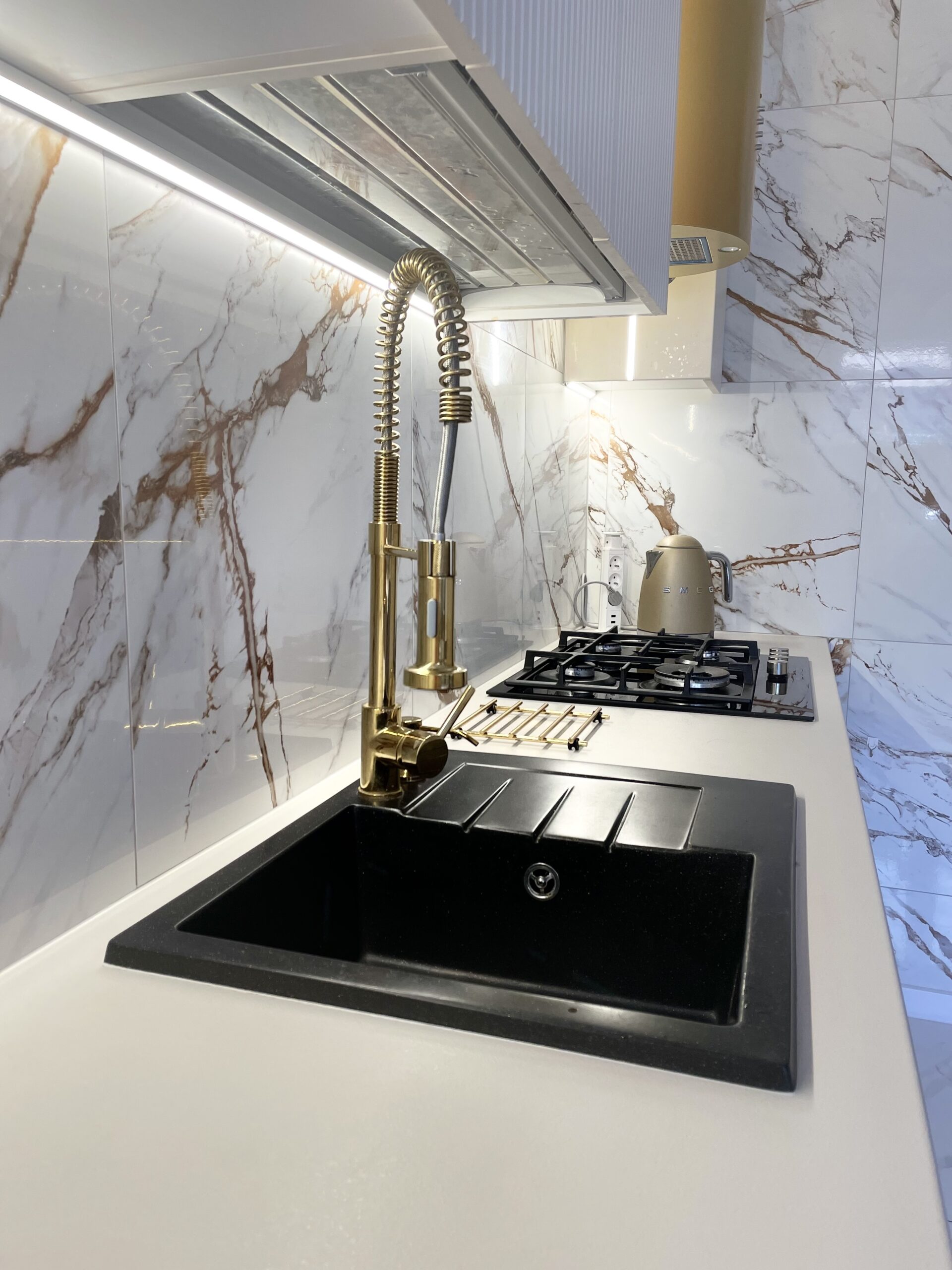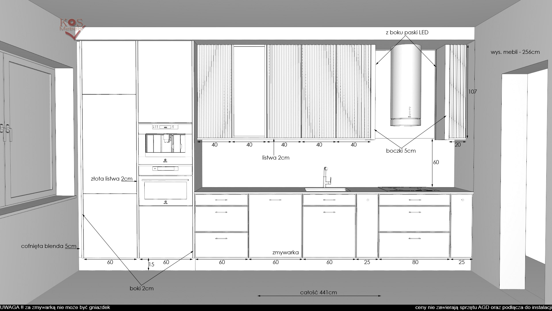 • Oświetlenie LED montowane po wiszącymi szafkami – oświetlenie ciepłe pod szafkami i z obu stron okapu pionowo