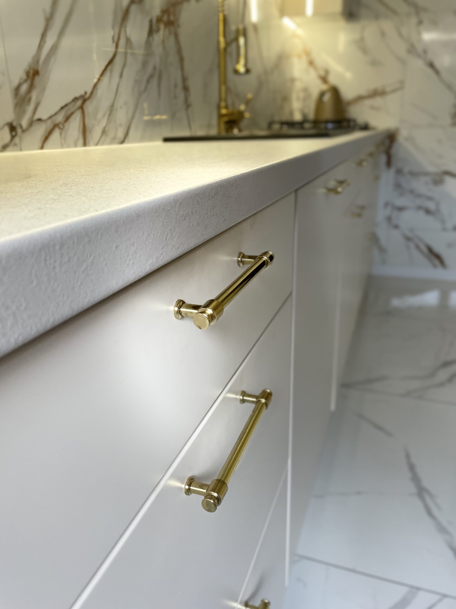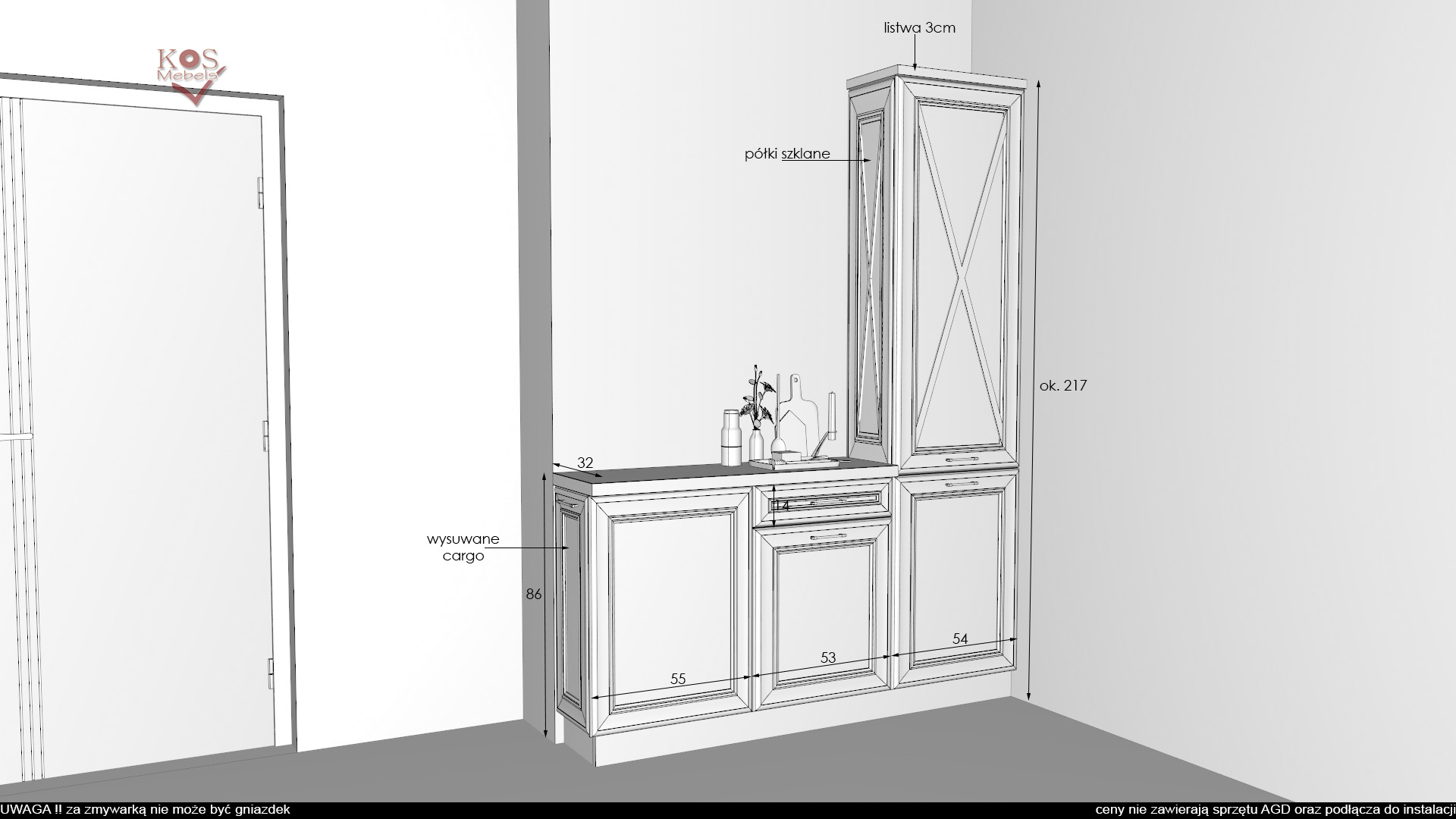 Warianty różnią się wykończeniem frontów – od białego matu z ozdobnym frezem Katania i klasycznymi witrynami ze szprosami, po gładkie fronty lakierowane na wysoki połysk z dekoracyjnym witrażem I29 i złotymi detalami. Każdy z projektów wzbogacono o stylowe uchwyty – od złotych gałek i uchwytów dolnych po nowoczesne systemy tip-on. Blaty laminowane w różnych dekorach (m.in. R22239, 63014) idealnie współgrają z kolorem zabudowy, a listwy wykończeniowe 3 cm nadają całości elegancki sznyt.