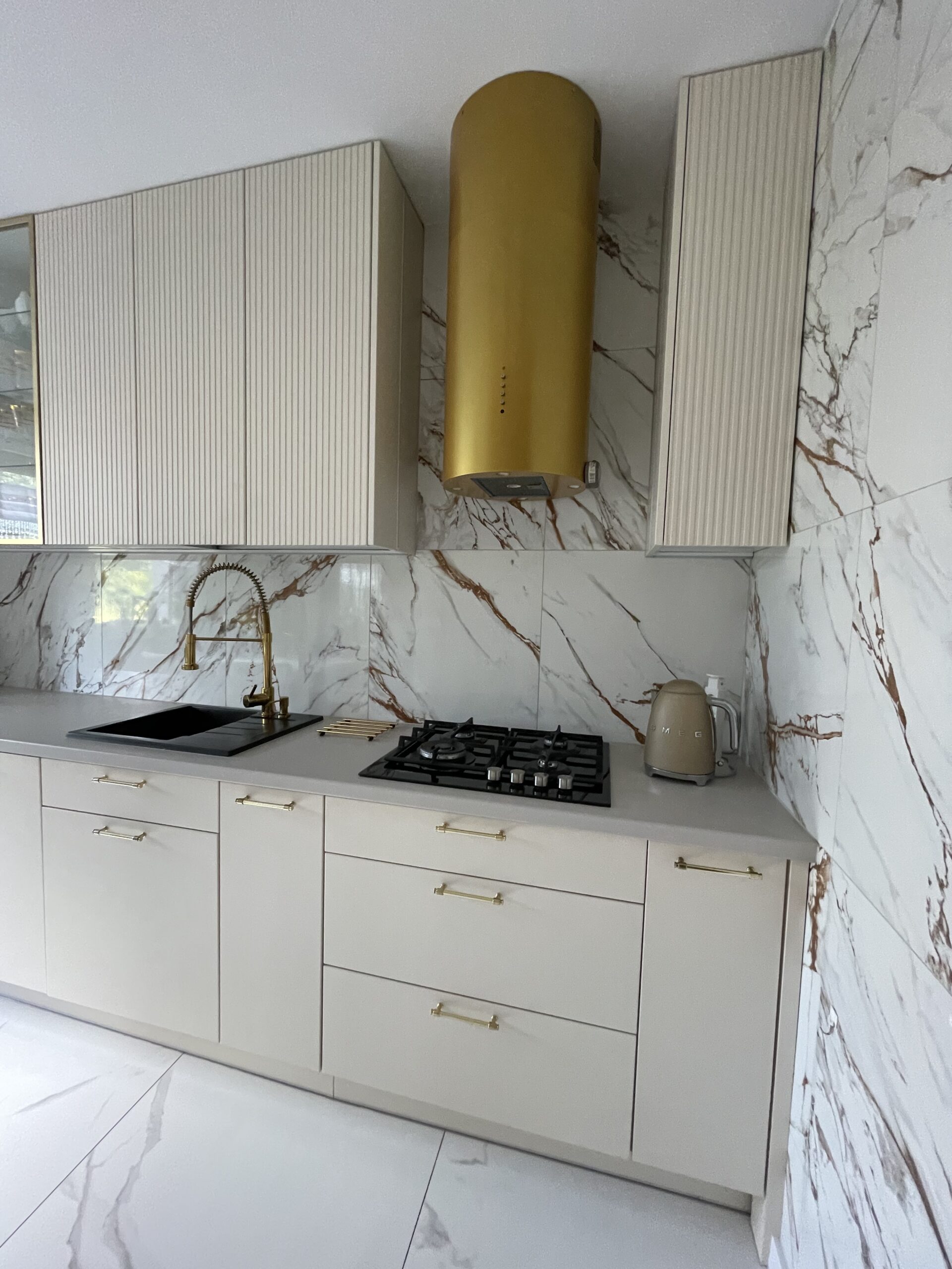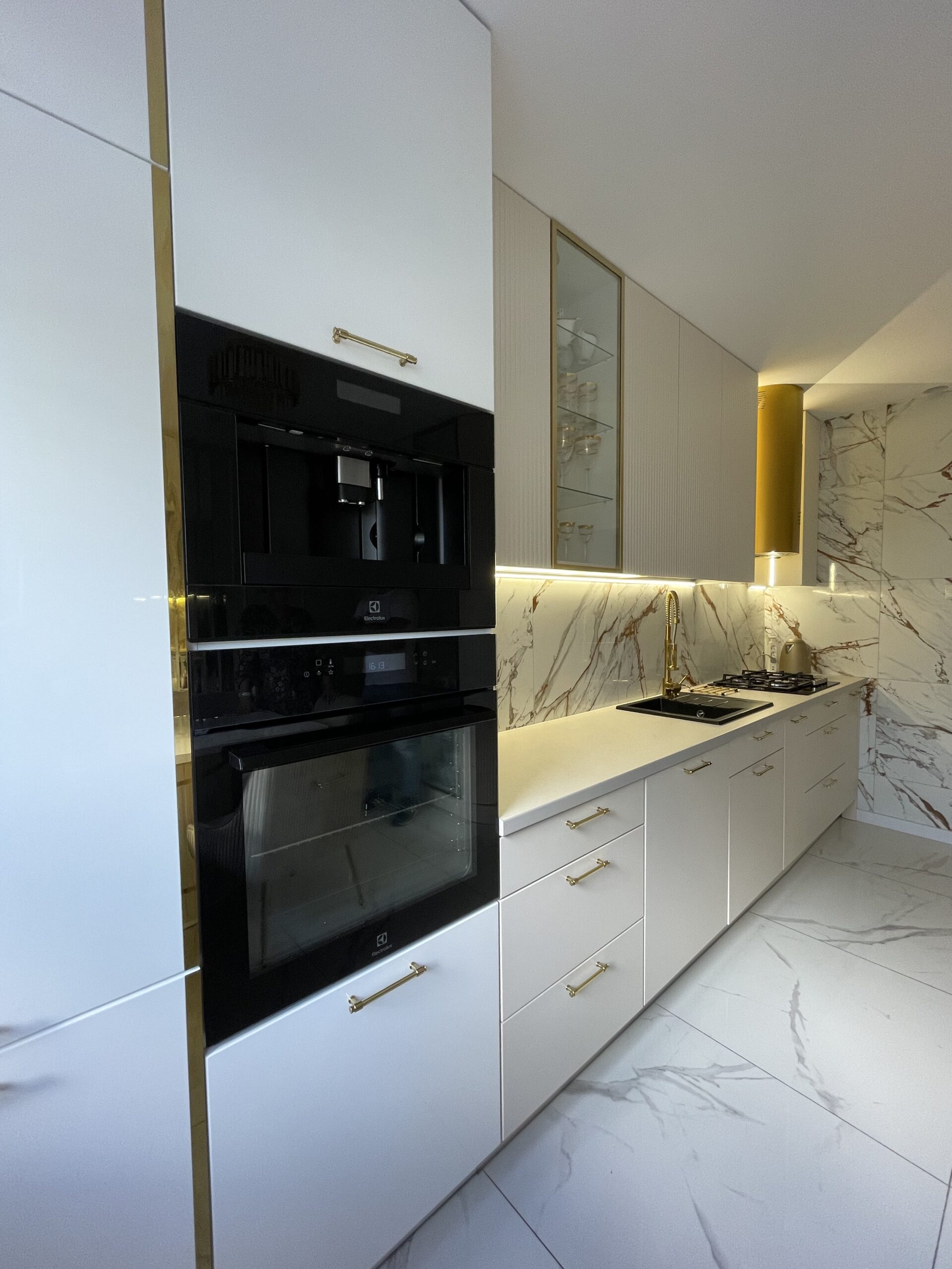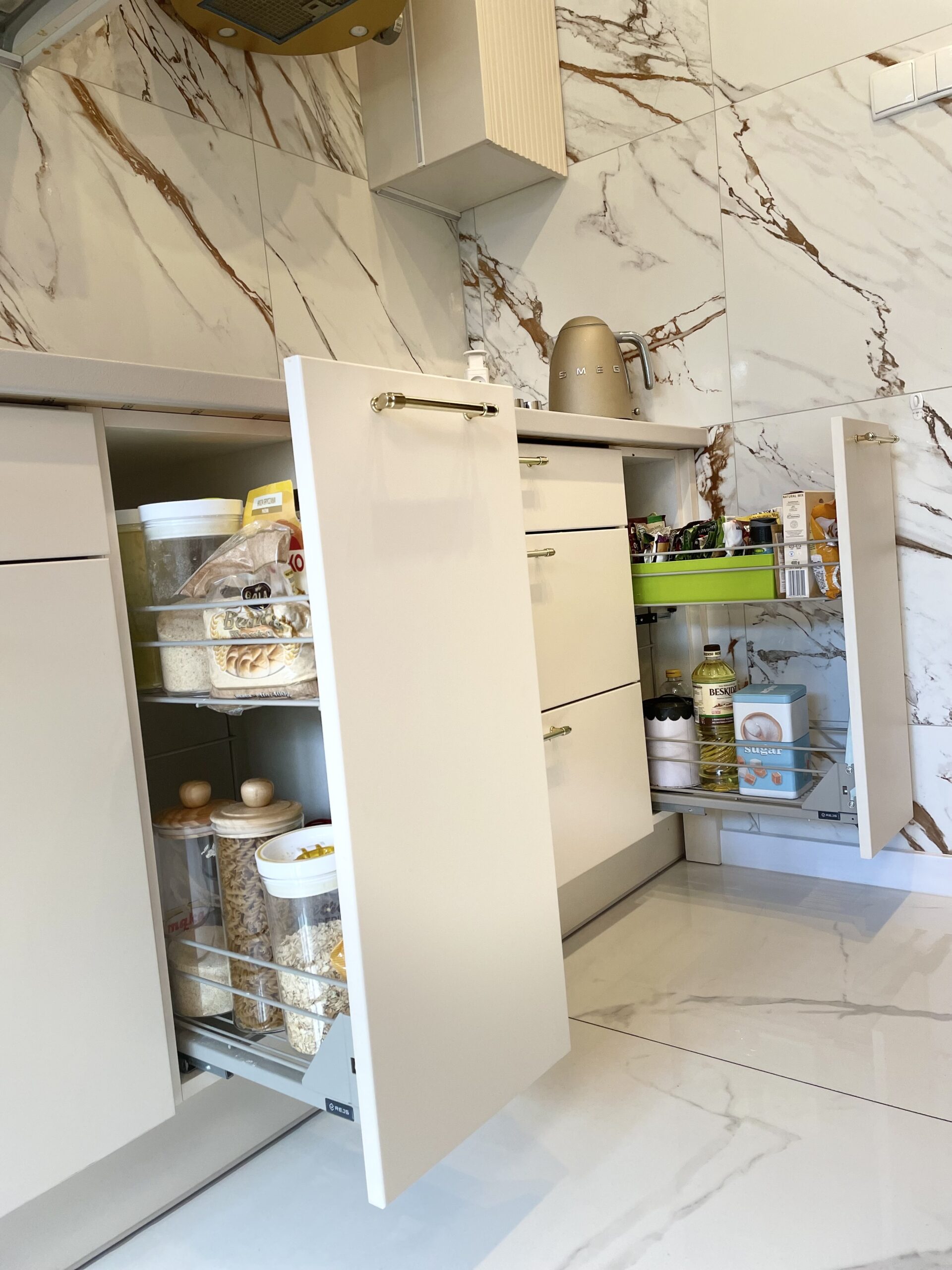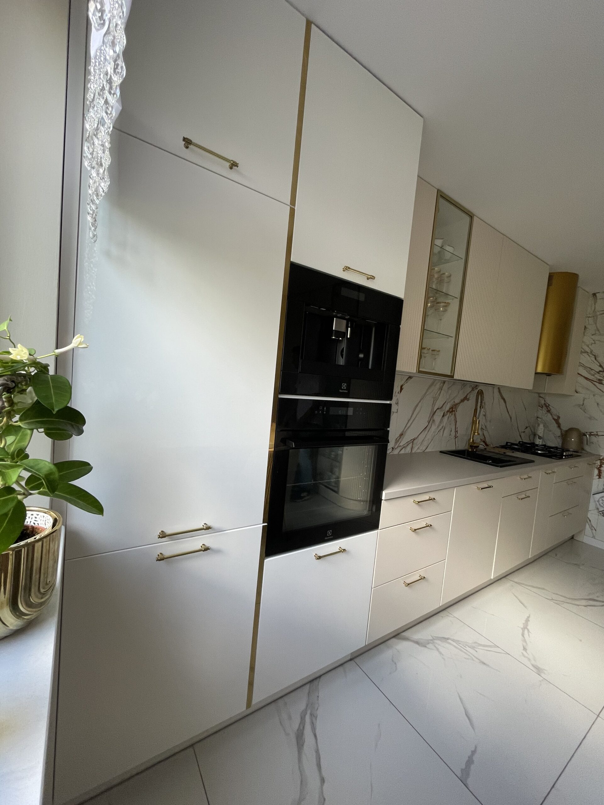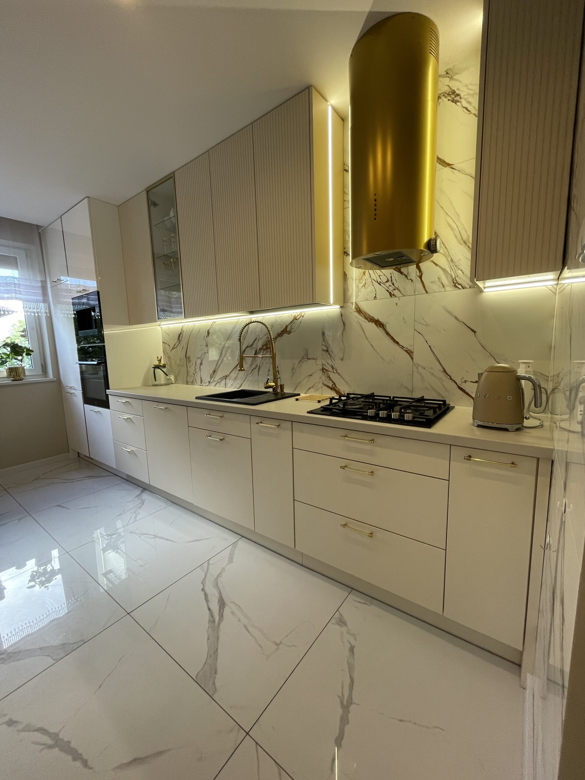 Dodatkowe funkcje takie jak systemowe szuflady z domykiem, oświetlenie LED podszafkowe, dwa kosze cargo 20 cm, czy kosz do segregacji odpadów, zapewniają codzienny komfort użytkowania. W wybranych wariantach zastosowano ciepłe oświetlenie boczne przy okapie, dekoracyjne paski złote oraz półokrągłe, gięte fronty lakierowane – to elementy, które wyróżniają tę realizację na tle standardowych kuchni.