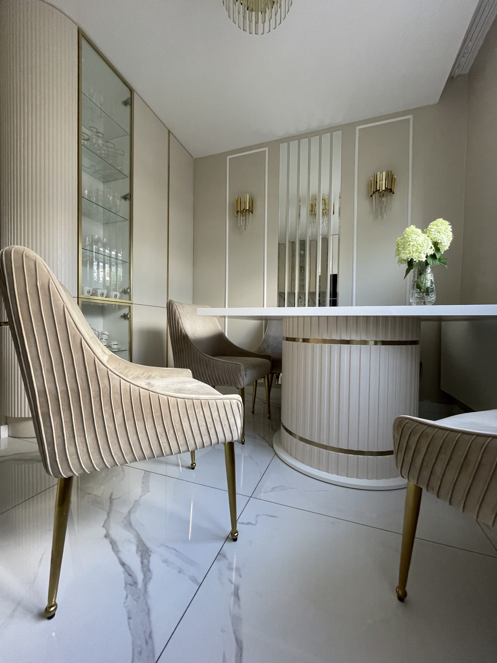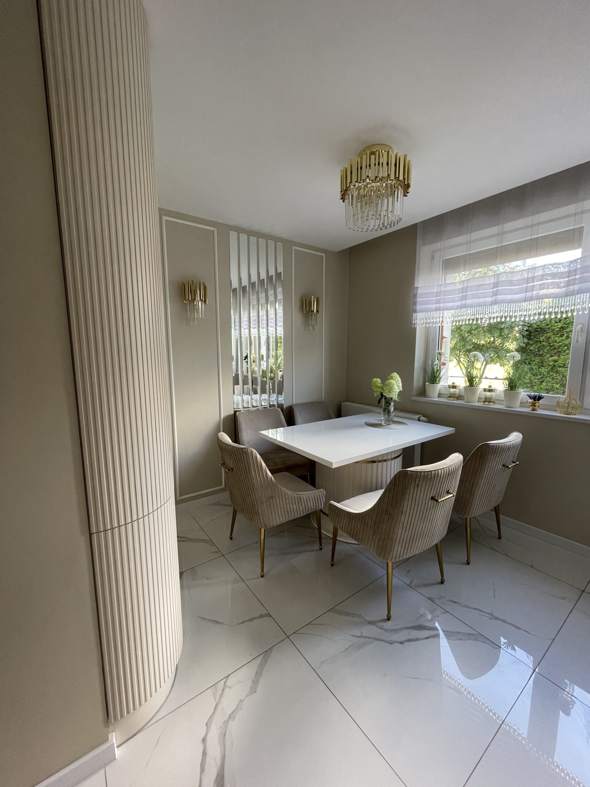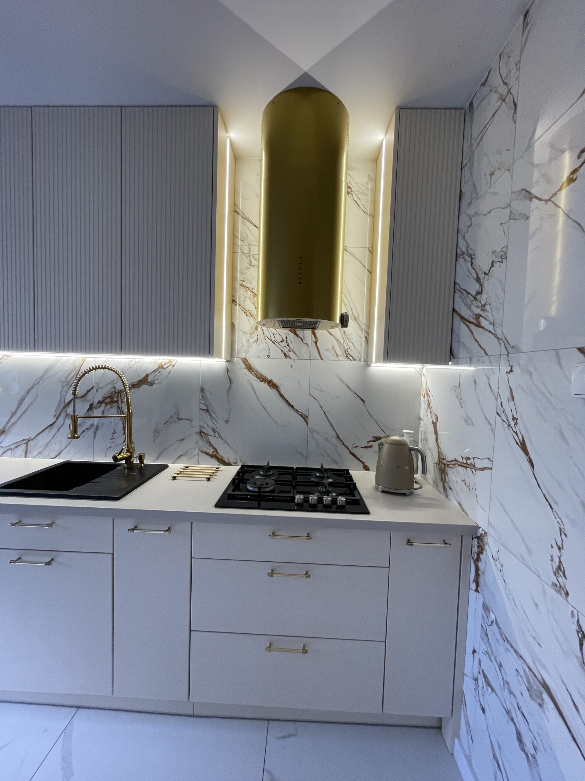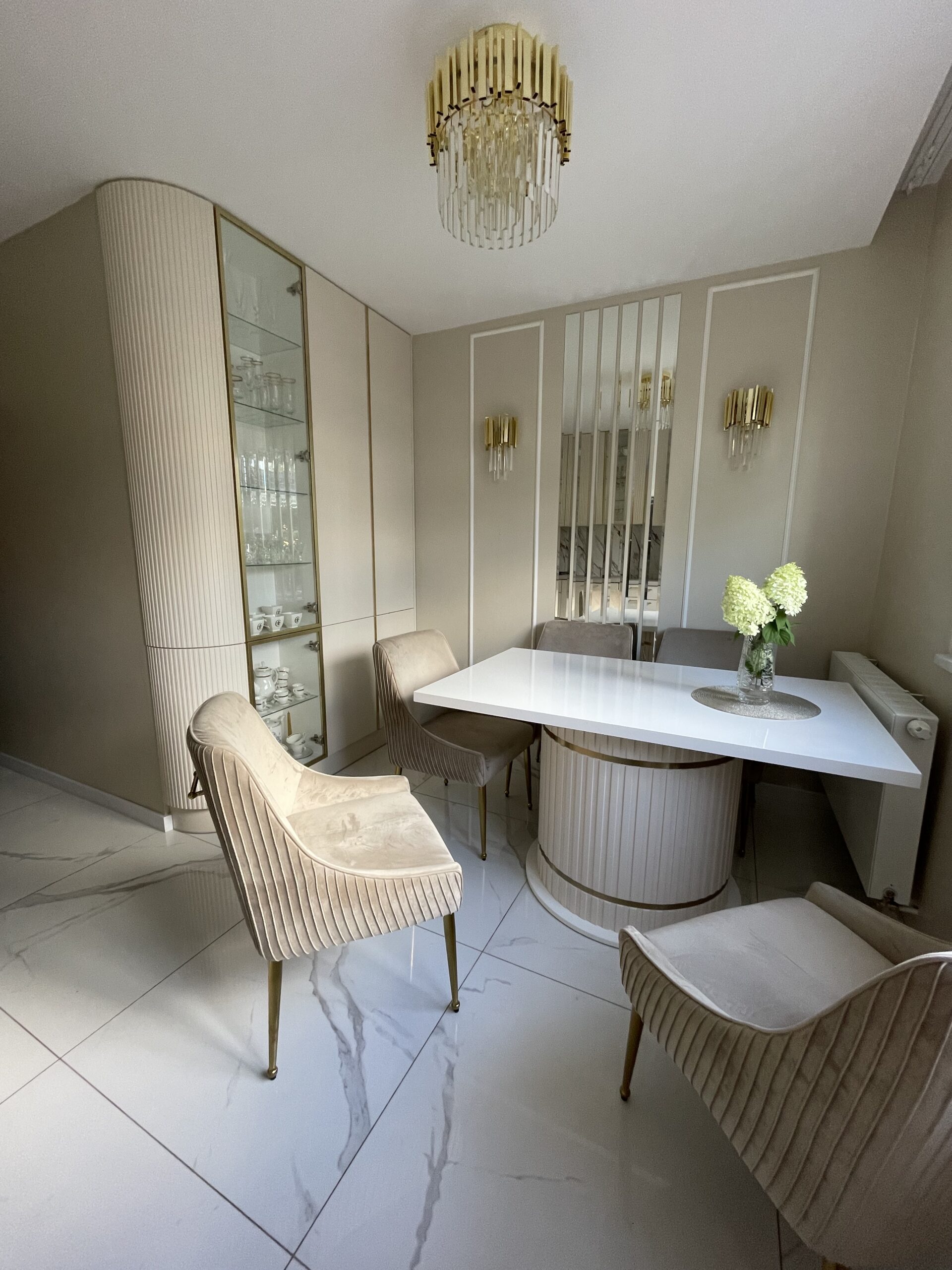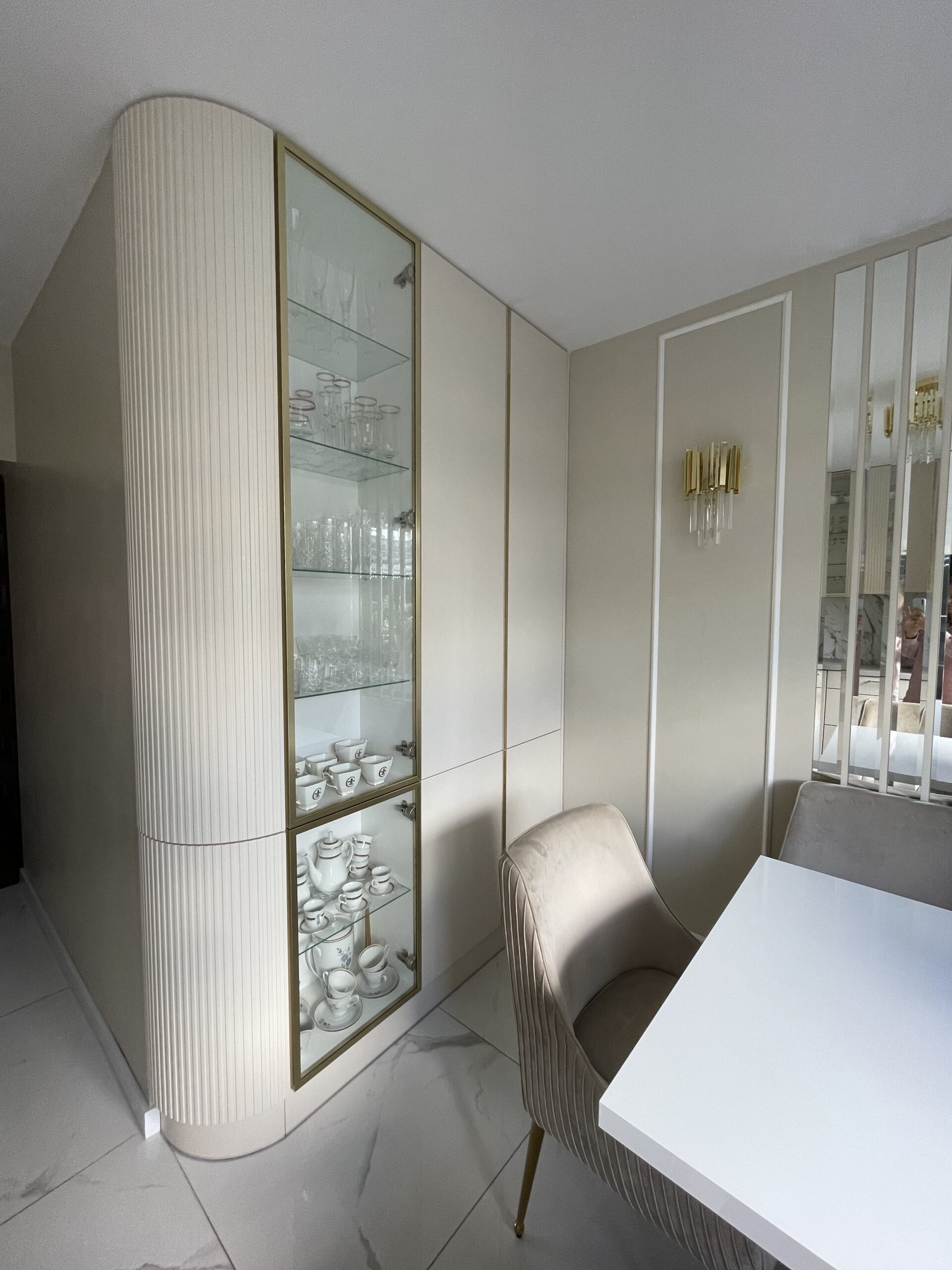 Dodatkowe funkcje takie jak systemowe szuflady z domykiem, oświetlenie LED podszafkowe, dwa kosze cargo 20 cm, czy kosz do segregacji odpadów, zapewniają codzienny komfort użytkowania. W wybranych wariantach zastosowano ciepłe oświetlenie boczne przy okapie, dekoracyjne paski złote oraz półokrągłe, gięte fronty lakierowane – to elementy, które wyróżniają tę realizację na tle standardowych kuchni.