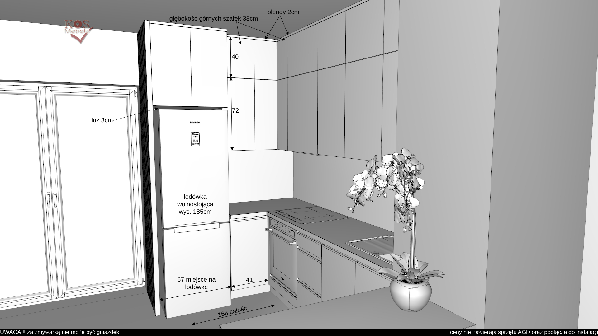 • Uchwyty szafki wiszące nad blatem: fronty opuszczone o 1cm / drzwi w szafkach nad lodówką i pod sufitem otwierane systemem tip-on