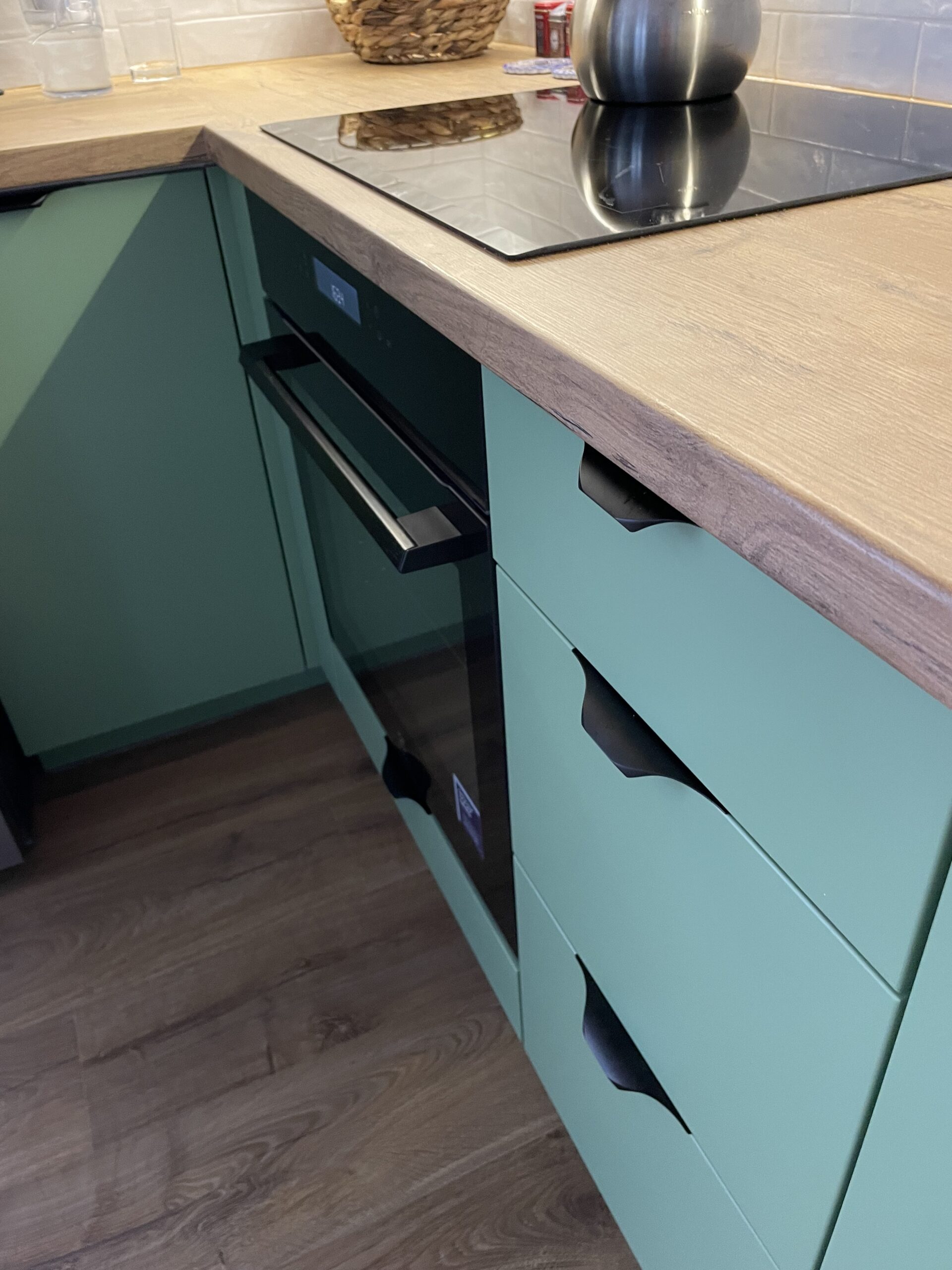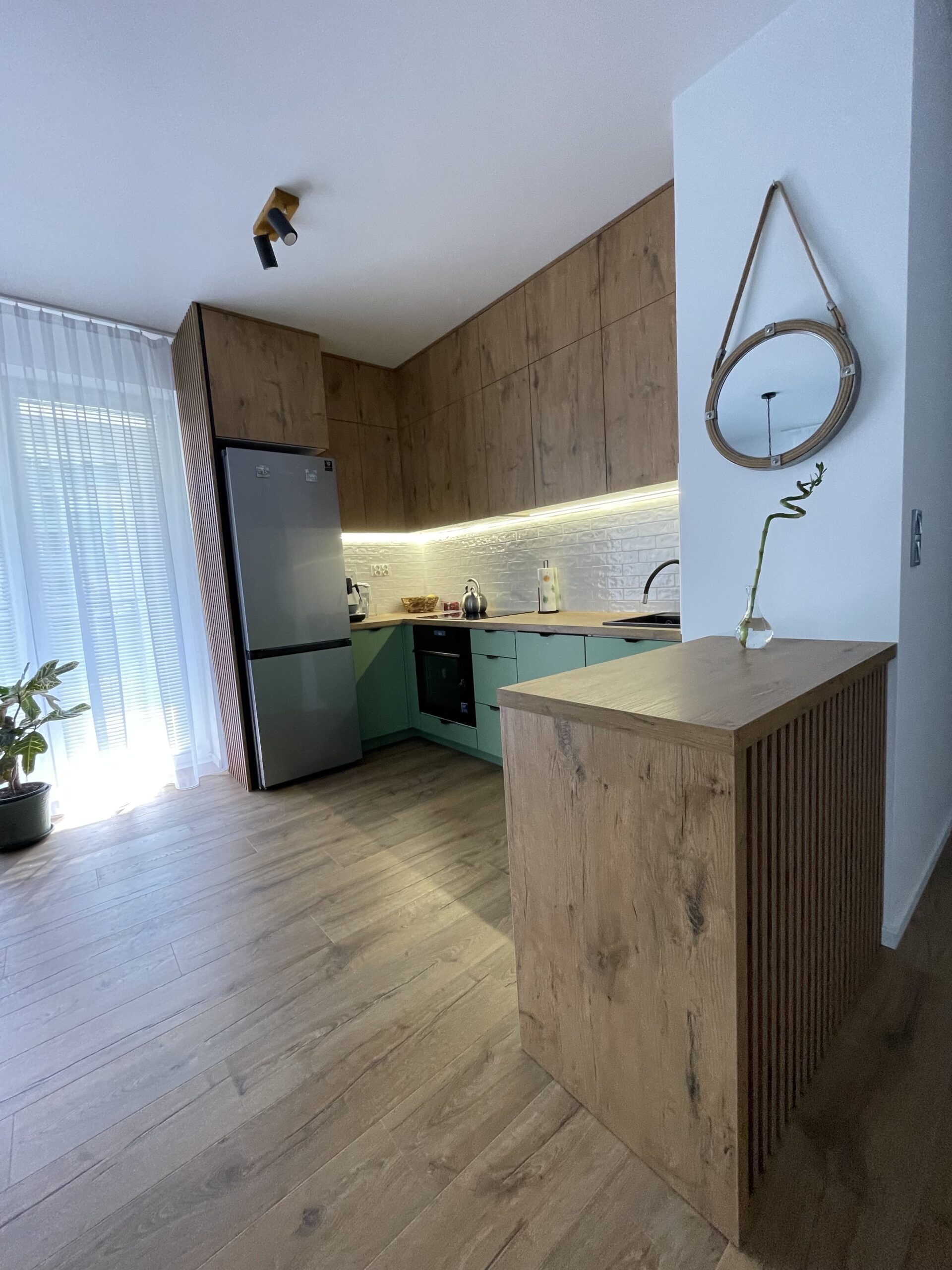 Projekt tej wyjątkowej kuchni na wymiar to doskonałe połączenie modnej zieleni RAL6021 z ciepłym dekorem drewna Dąb Lancelot (K003). Zabudowa została zaprojektowana tak, by łączyć estetykę, ergonomię i funkcjonalność w codziennym użytkowaniu. Realizacja wykonana przez firmę Kosmebels idealnie wpasowuje się w nowoczesne wnętrza z nutą naturalnego klimatu.