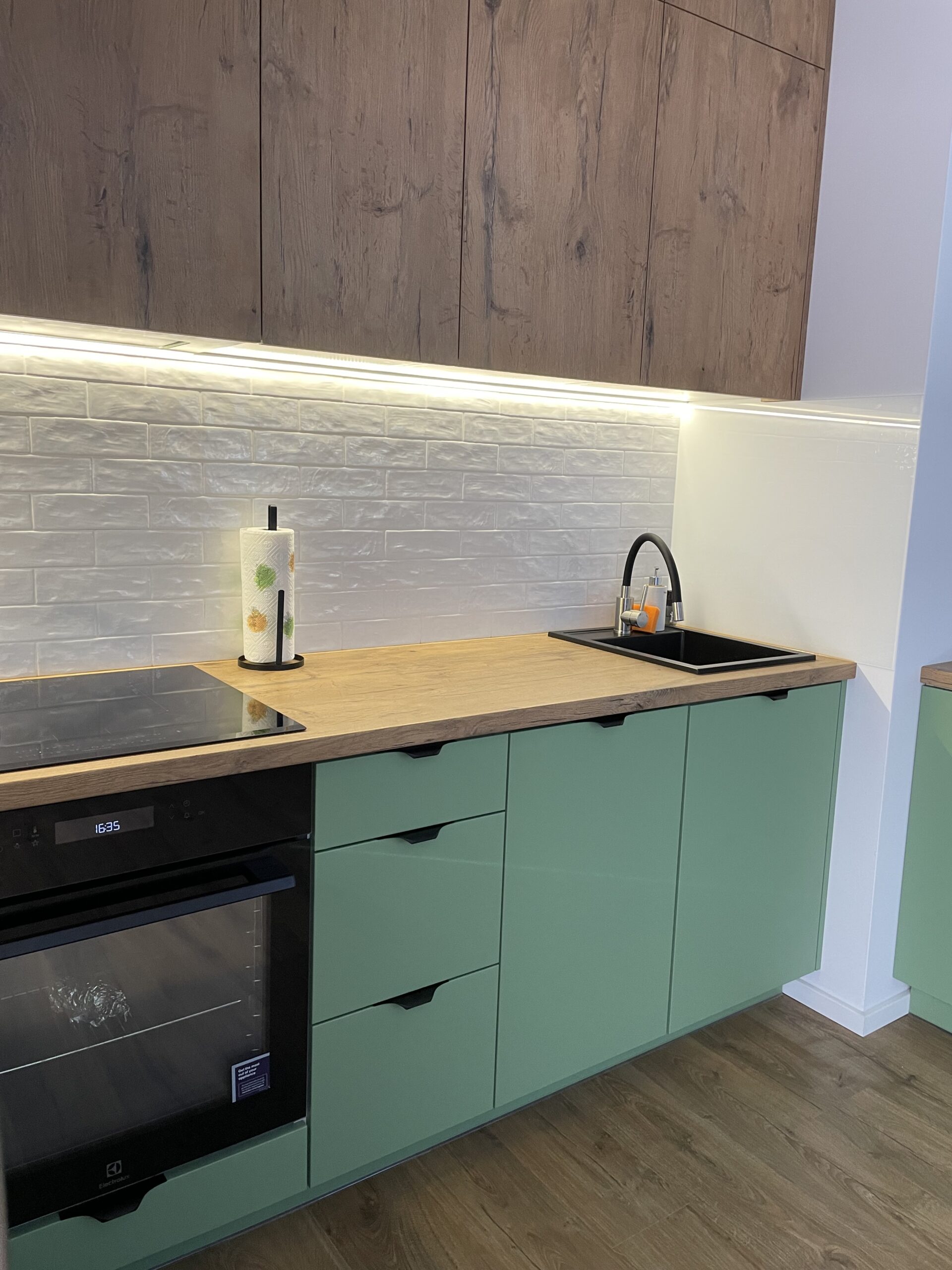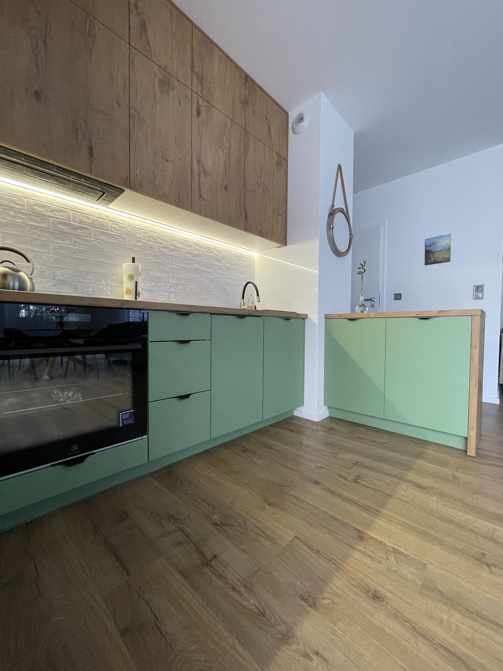Dolne fronty oraz widoczne elementy korpusu wykończono w eleganckim macie RAL6021, podczas gdy górna zabudowa została wykonana z płyty laminowanej Dąb Lancelot z pionowym usłojeniem, tworząc spójną kompozycję z blatem w tym samym dekorze. Niewidoczne elementy wykonano z trwałej, białej płyty laminowanej matowej.